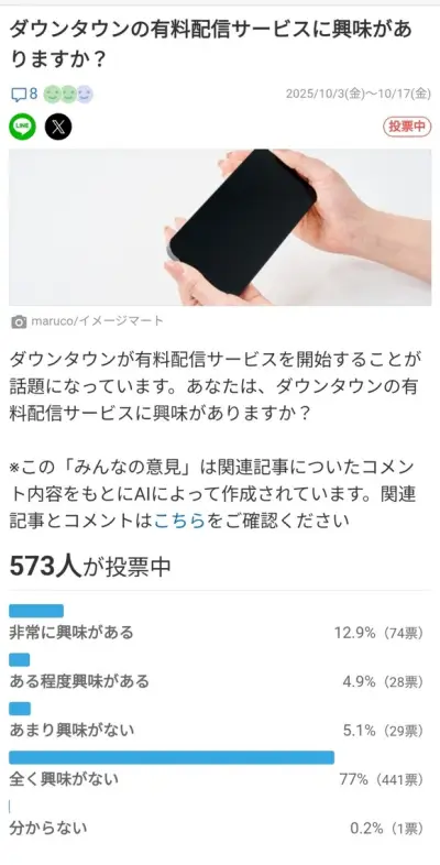 【悲報】ダウンタウン+(プラス)、Yahoo投票アンケートで「あまり興味がない」77.0%突破wwwwwww
