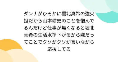 ダンナがひそかに堀北真希の強火担だから山本耕史のことを憎んでるんだけど仕事が無くなると堀北真希の生活水準下がるから嫌だってことでクソがクソが言いながら応援してる