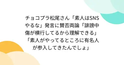 チョコプラ松尾さん「素人はSNSやるな」発言に賛否両論「誹謗中傷が横行してるから理解できる」「素人がやってるところに有名人が参入してきたんでしょ」