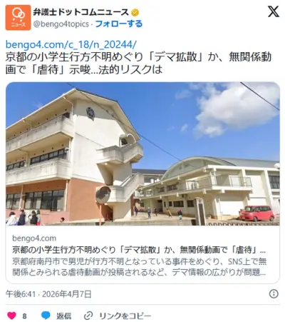 京都の小学生行方不明めぐり「デマ拡散」か、無関係動画で「虐待」示唆…法的リスクは