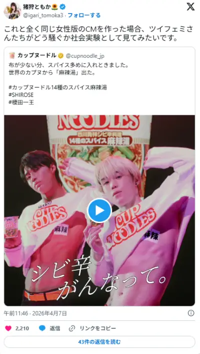 「下品」と物議のカップヌードルCMにアイドル「これと全く同じ女性版のCMを作った場合ツイフェミさんががどう騒ぐか見てみたい」