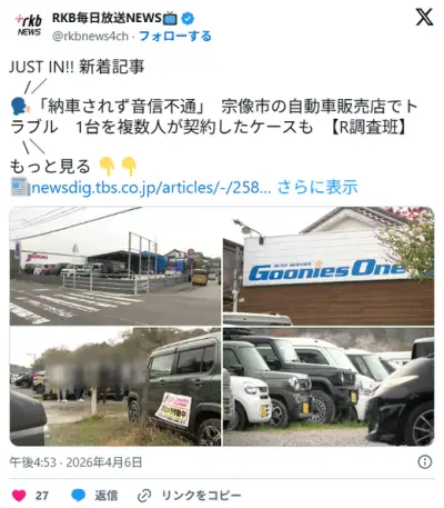 宗像の中古車店・グーニーズワンが夜逃げ 被害額は数億円と見られる