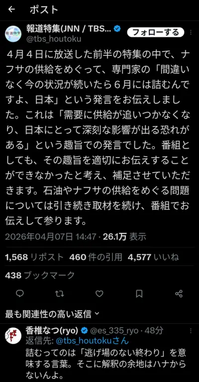 【速報】TBS報道特集、SNSでこっそり「補足させていただきます」→高市首相が指摘した「事実誤認」意地は認めない?流石に補足では厳しい