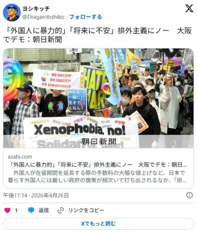 「外国人に暴力的」「将来に不安」排外主義にノー 大阪でデモ