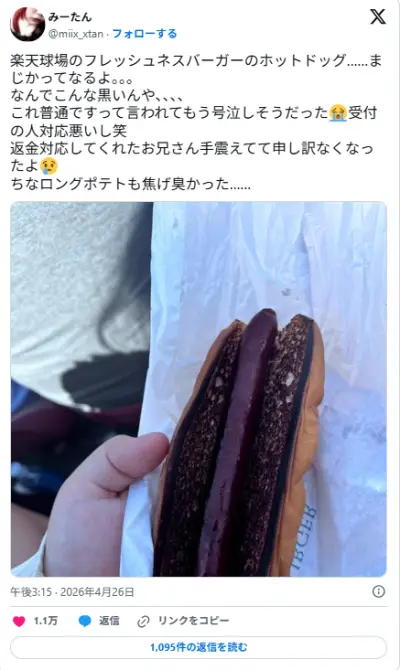 楽天球場のフレッシュネスバーガー、ホットドックが黒すぎて炎上