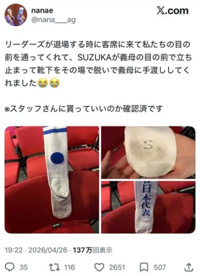 【画像】新しい学校のリーダーズのSUZUKAさん、脱ぎたてホヤホヤの臭そうな靴下をファンにプレゼント
