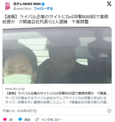 ライバル企業のサイトにDoS攻撃8000回で業務妨害か IT関連会社代表ら2人逮捕 千葉県警