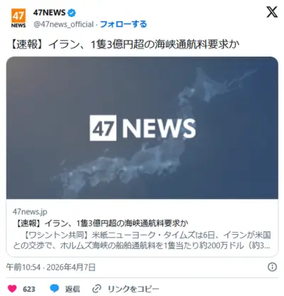 イラン、1隻3億円超のホルムズ海峡通航料要求か