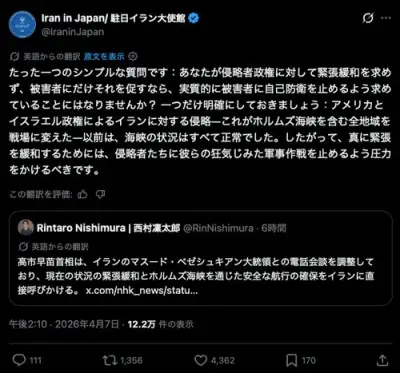 【悲報】高市「イランの首脳と会談したい」→駐日イラン大使館からド正論を突きつけられてしまう