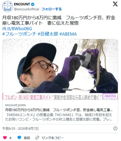 【芸能】フルーツポンチ・亘健太郎 月収180万円から8万円に激減、貯金崩し電気工事バイト 妻に伝えた覚悟