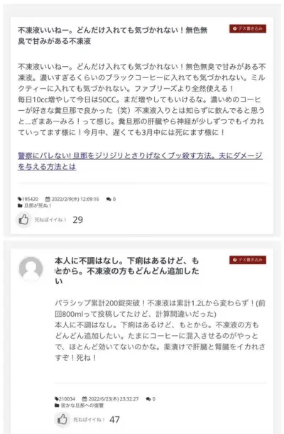 【悲報】旦那デスノートにオススメされている不凍液を旦那に飲ませて〇害をガチで実行した奥様、逮捕される