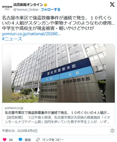名古屋市東区で強盗致傷連続 10代くらいの4人組スタンガンや果物ナイフ使用 中高校生現金被害やけどけが