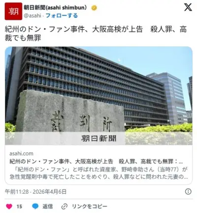 【和歌山】紀州のドン・ファン事件、大阪高検が上告 殺人罪、高裁でも無罪