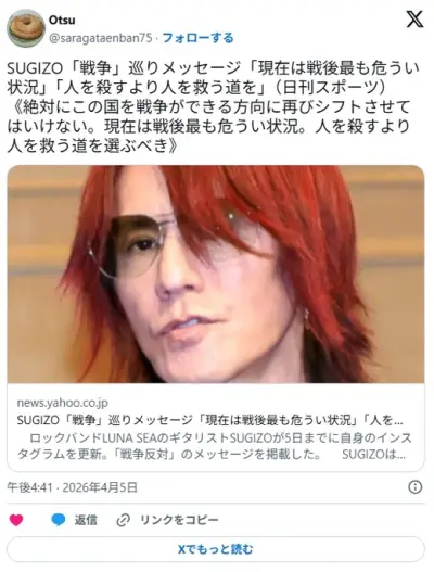 SUGIZO「戦争反対」のメッセージ「一握りの指導者のためにほとんどの人間が犠牲となっている。狂っている…殺すより人を救う道を」