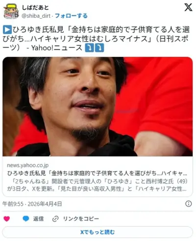 ひろゆき氏 「金持ちは家庭的で子供育てる人を選びがち…ハイキャリア女性はむしろマイナス」