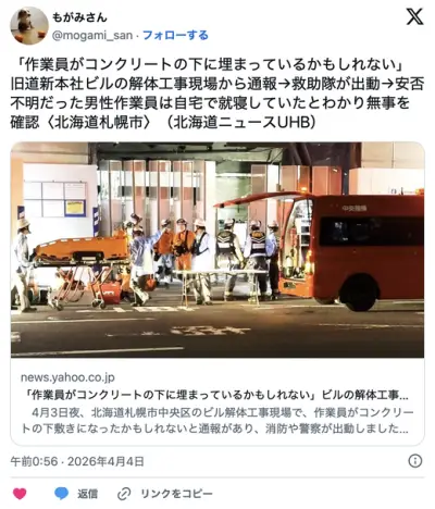「作業員がコンクリートの下に埋まっているかもしれない」ビルの解体工事現場から通報→救助隊が出動→