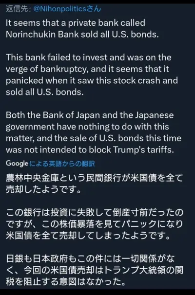 【速報】関税90日停止をさせた農林中金が売却した米国債の量が話題「世界経済を救ったがまた大損した模様」