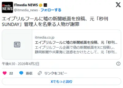エイプリルフールに嘘の新聞紙面を投稿、元「秒刊SUNDAY」管理人を名乗る人物が謝罪