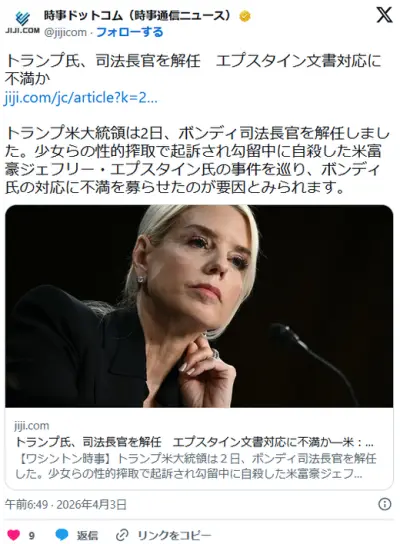トランプ大統領、エプスタイン文書を追加公開しようとした容疑で司法長官を解任🥹