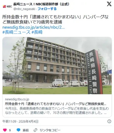 70歳男性、所持金十数円で空腹に耐えかね「逮捕されても構わぬ」とハンバーグ6500円分を無銭飲食…
