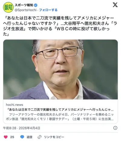 徳光和夫 大谷翔平に「あなたは日本で二刀流で実績を残してメジャーへ行ったんじゃないですか?」「WBCの時に投げて欲しかった」