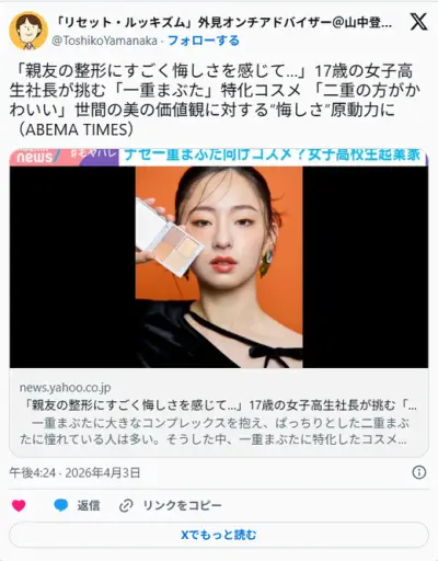【動画】美人女子高生起業家、一重瞼向けのコスメを制作も美人すぎると話題
