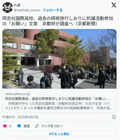 同志社国際高校、過去の研修旅行しおりに抗議活動参加の「お願い」文章 京都府が調査へ