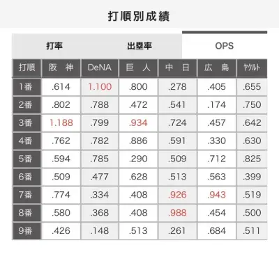 【最新版】セリーグ・打順別OPS、更新されるwwwwwwwwww