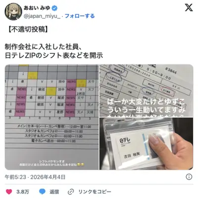 【悲報】新入社員さん、日テレZIPのシフト表などを開示して無事無職へwwwwww【吉田 柚実】