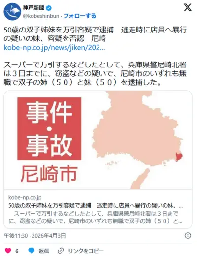 【兵庫】50歳の無職双子姉妹を万引容疑で逮捕 逃走時に店員へ暴行の疑いの妹、容疑を否認 尼崎
