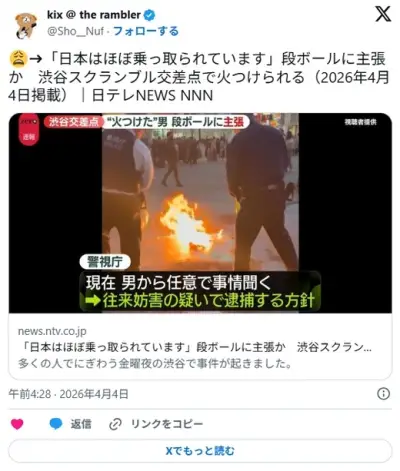 【東京】「日本はほぼ乗っ取られています」段ボールに主張か 渋谷スクランブル交差点で火つけられる 出頭したのは50代日本国籍の男