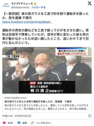 バス運転手逮捕 青信号なのに停車→追い越しに激昂→割り込み急減速→クロスレンチでガラス破壊→暴行