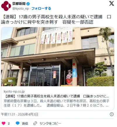 【京都】17歳の男子高校生を殺人未遂の疑いで逮捕 口論きっかけに背中を突き刺す 容疑を一部否認