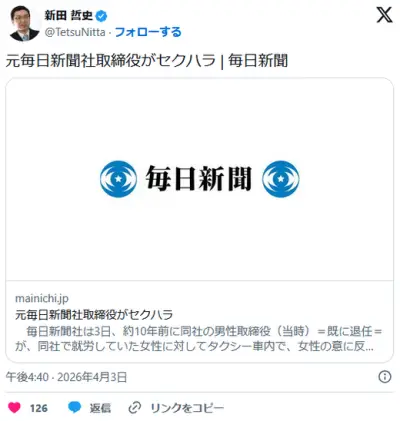 元毎日新聞社取締役がセクハラ タクシー車内で、女性の意に反しキス