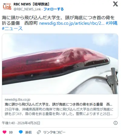 【注意】海に頭から飛び込んだ大学生、頭が海底につき首の骨を折る重傷 西原町