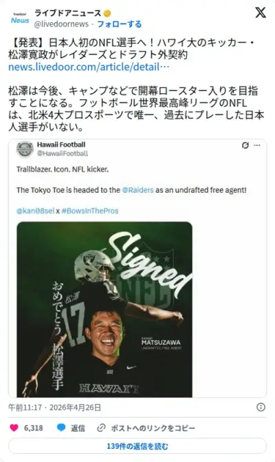 【朗報】松澤寛政さん、北米4大スポーツ最後の未踏領域NFLと契約してしまう
