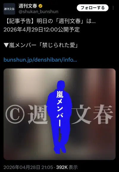 【悲報】嵐さん、文春に「禁じられた愛」と予告されてしまう