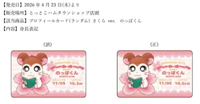 【悲報】 ハム太郎の公式ショップ、「のっぽくん」の身長を「10.5m」と誤植