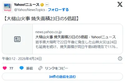 【岩手】大槌の山林火災、焼失面積431ヘクタールに 23日中に倍増