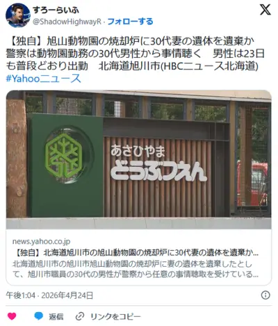 【旭川】旭山動物園の焼却炉に30代妻の遺体を遺棄か 警察は動物園勤務の30代男性から事情聴く 男性は23日も通常どおり出勤