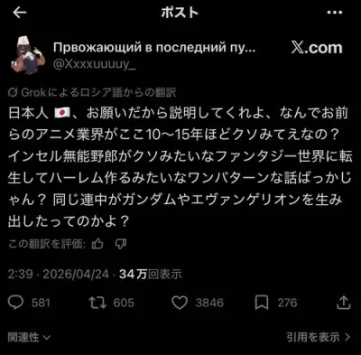 【悲報】ロシア人さん、日本のアニメに物申してしまう
