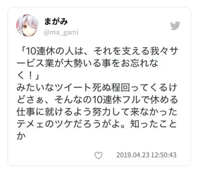 【悲報】X民「『GW中も仕事してるサービス業敬え』って喚いてる奴さぁ、GW休める職に就けよ負け組」