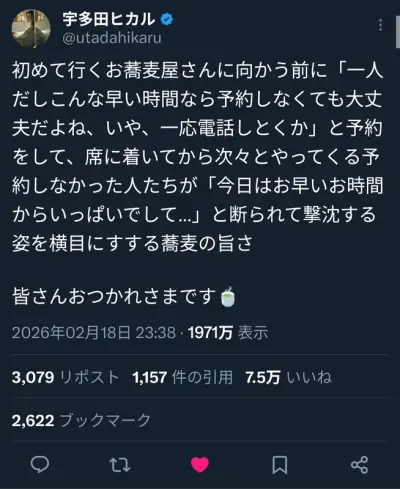 宇多田ヒカル「そば屋」投稿がSNS波紋 賛否割れる