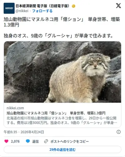 【悲報】マヌルネコのグルーシャさん、単身1.3億円億ション暮らしになってしまう