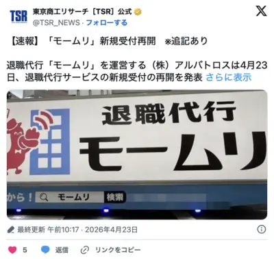 モームリ運営会社アルバトロス、退職代行サービスの営業再開を発表
