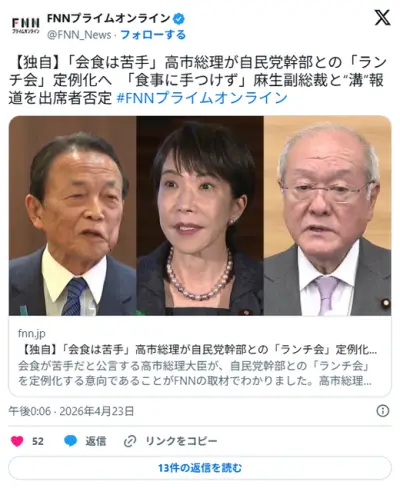 毎日「高市ランチ会、焼魚定食に麻生は手を付けなかった!麻生と高市に溝」 →出席者「食べていた」