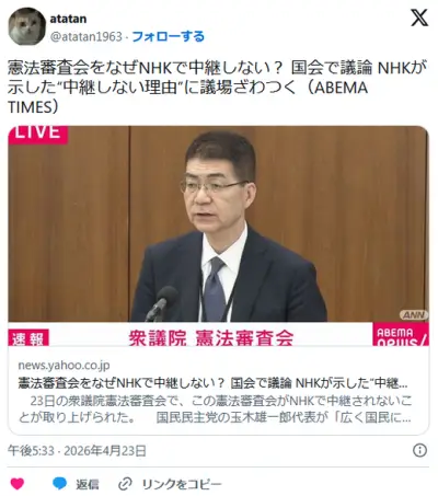 国会「なんで憲法審査会を中継しないの?」 NHK「国民の関心がそこまで高くない」 舐めてんだろこいつら