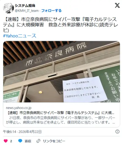 【奈良】市立奈良病院にサイバー攻撃『電子カルテシステム』に大規模障害 救急と外来診療が休診に