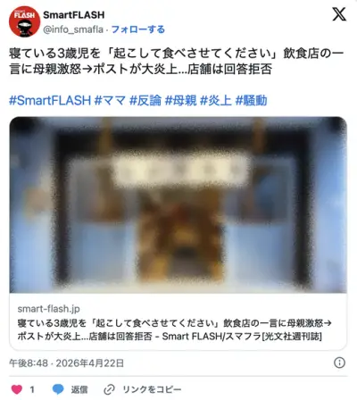 【𝕏】寝ている3歳児を「起こして食べさせてください」飲食店の一言に母親激怒→ポストが大炎上…店舗は回答拒否