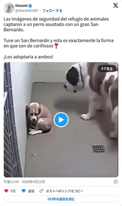 【動画】シェルターで怯えてた小型犬さん、セントバーナードの懐で爆睡してしまう